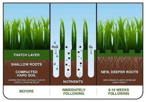 Diagram showing how aeration opens soil and allows water, air, and nutrients to reach roots through the thatch layer.